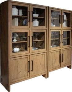 Le buffet Wilcox est doté de quatre portes en verre trempé avec cadre en bois, de deux étagères réglables et d'une étagère fixe en verre trempé avec cadre en bois et rainures pour assiettes. Sa finition chaleureuse et son design élégant lui confèrent un charme intemporel et une fonctionnalité pratique.Read More